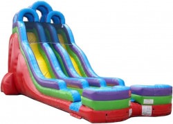 Double the fun with this 26' Retro Rainbow Double Lane Inflatable Water Slide! Standing at a huge 26 feet tall and extending out to a massive 45 feet in length, racing down this double lane slide to the bottom is a thrill ride like no other for a child. With 2 sliding lanes, wait times are cut in half and the line will keep on moving quickly! With its gender-neutral colors, this versatile inflatable can be employed for an all-boys or all-girls event! Try out this inflatable slide on a cool day without water for some fun and entertainment or simply connect a standard garden hose to the built-in misting system and dive into some refreshing relief from the summer heat! All of our inflatable wet / dry slides were designed with children's safety at heart, featuring an inflated landing zone with built-in drains that keeps the water level low enough for a good time, but safe enough for kids of all ages.